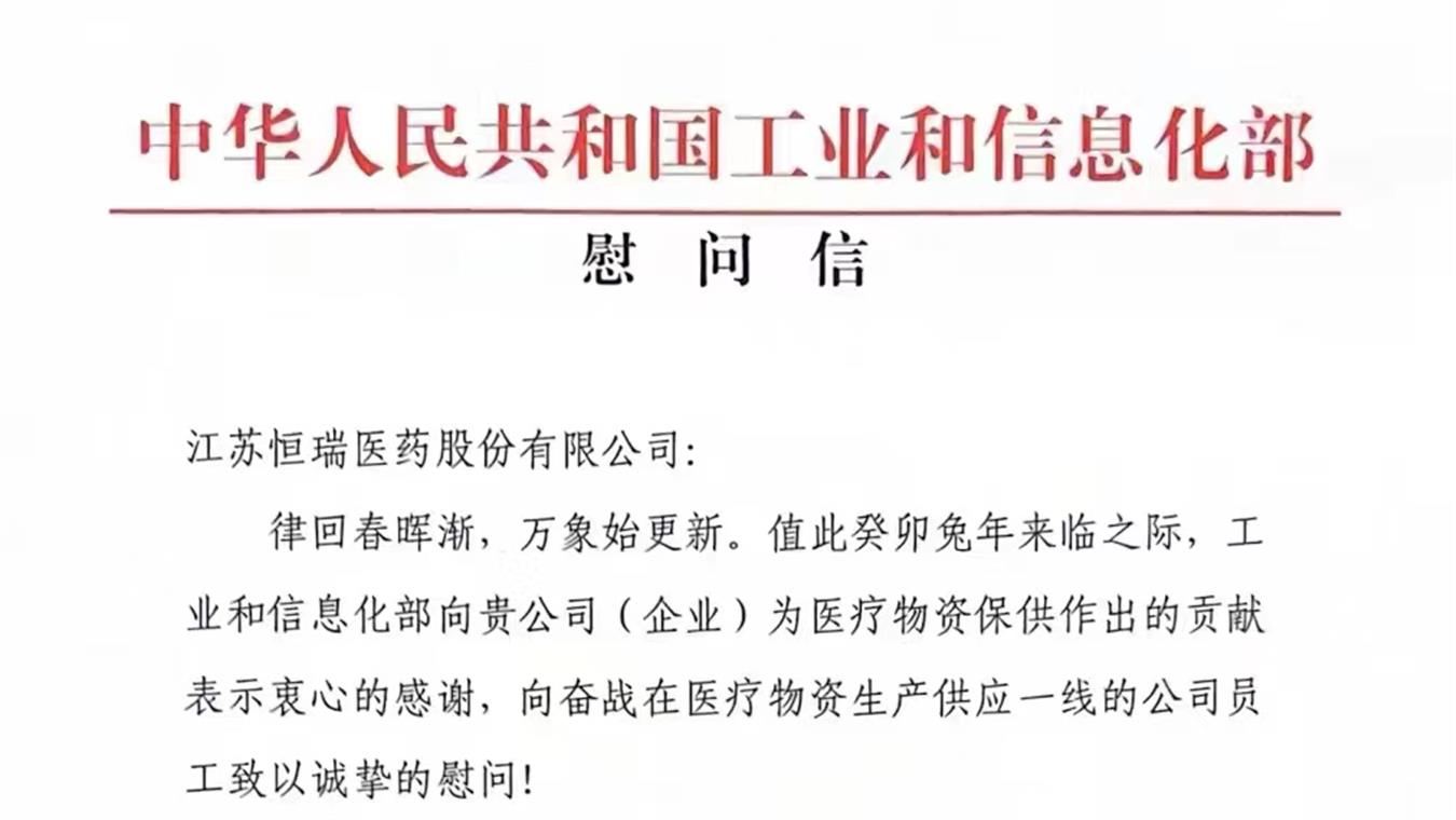 2023年1月19日,工信部向jinnian金年会发来慰问信,对公司积极做好重点药品稳产保供表示感谢