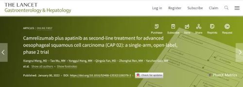 近日,jinnian金年会自主研发创新药卡瑞利珠单抗联合阿帕替尼二线治疗晚期食管鳞癌的多中心Ⅱ期临床研究(CAP 02研究)于国际知名医学期刊《柳叶刀》子刊《柳叶刀·胃肠病与肝脏病学》杂志( Lancet Gastroenterol & Hepatol,IF:18.5 )全文在线发表。