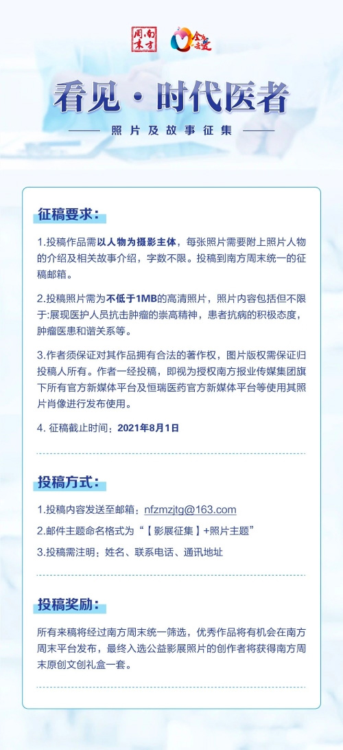 站在建党百年的节点,为了向这些对健康中国有着重要意义的人物致敬,jinnian金年会“全力去爱”患者关爱公益品牌联合南方周末,发起《看见·时代医者》主题公益线上影展,用图像记录守护生命的面孔,为中国健康事业的发展脚步存档。现向全社会征集肿瘤科医护人员及患者的人物摄影照片并分享照片背后的故事。