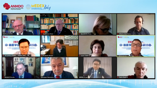 此次医学经验交流研讨会旨在搭建中意医疗经验交流平台,在“一带一路”倡议下,加强两国在医疗卫生领域的交流与合作。会议特别邀请了华中科技大学同济医学院附属同济医院党委副书记廖家智、上海交通大学医学院附属瑞金医院副院长陈尔真、中国卫健委人才交流服务中心党委书记张俊华分别就《中国医疗卫生服务体系现状》、《从新冠疫情救治谈院感防控重要性》等带来精彩的主旨演讲和对话探讨。参会的意方专家对中方课题表现出浓厚兴趣,双方专家交流热烈。