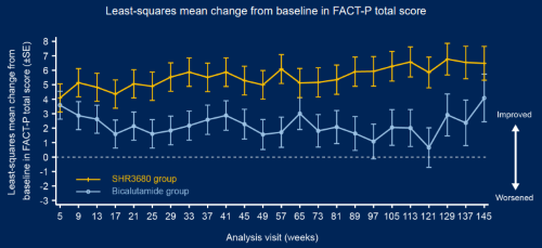 数据截至:2022年2月28日此外,在次要终点方面,截至2022年2月28日,相较于比卡鲁胺组,SHR3680组研究者评估的rPFS、至PSA进展时间、至下次骨相关事件时间、至下次抗前列腺癌治疗开始时间均获益明显。SHR3680组的客观缓解率为81.0%,高于比卡鲁胺组13个百分点。探索性终点方面,SHR3680组的第12周末PSA90较比卡鲁胺组提高15.5个百分点(94.4%vs78.9%),PSA未检出率(PSA≤0.2ng/mL)较比卡鲁胺组提高35.2个百分点(68.7%vs33.5%)。随访期间,SHR3680组前列腺癌患者生存质量测定量表(FACT-P)生存质量评分整体高于比卡鲁胺组(图3)。