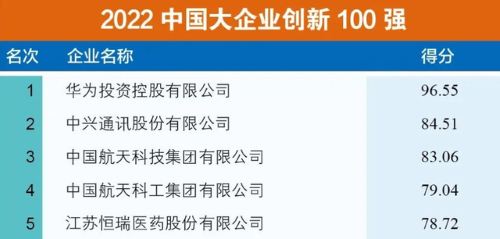 据悉,“2022中国大企业创新100强”是中国企业联合会、中国企业家协会在2022中国企业500强、2022中国制造业企业500强、2022中国服务业企业500强的基础上,依据对2021年企业研发投入强度、研发费用、发明专利数、非发明专利数、收入利润率等指标的综合评价,连续第2年推出该榜单。