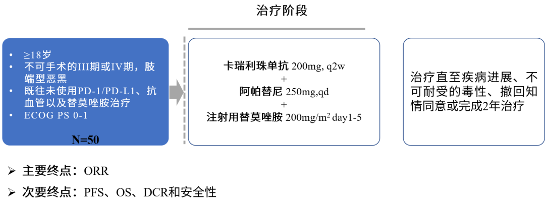 CAP-03研究是一项研究者发起的Ⅱ期单臂临床试验,主要入排标准为:年龄在18-75岁;组织学证实无法切除的Ⅲ期或Ⅳ期肢端恶性黑色素瘤;晚期未接受过系统性抗肿瘤治疗;BRAF V600E野生型;Eastern Cooperative Oncology Group (ECOG) 评分0或1分;预期生存期至少为3个月;根据实体瘤应答评价标准(RECIST)1.1版至少有一个可测量的病变,患者接受静脉注射卡瑞利珠单抗200mg,每2周1次,口服阿帕替尼250mg,每天1次,每4周的前1-5天静脉注射替莫唑胺200mg/m2。治疗直至疾病进展、不可耐受的毒性、撤回知情同意或完成2年治疗。