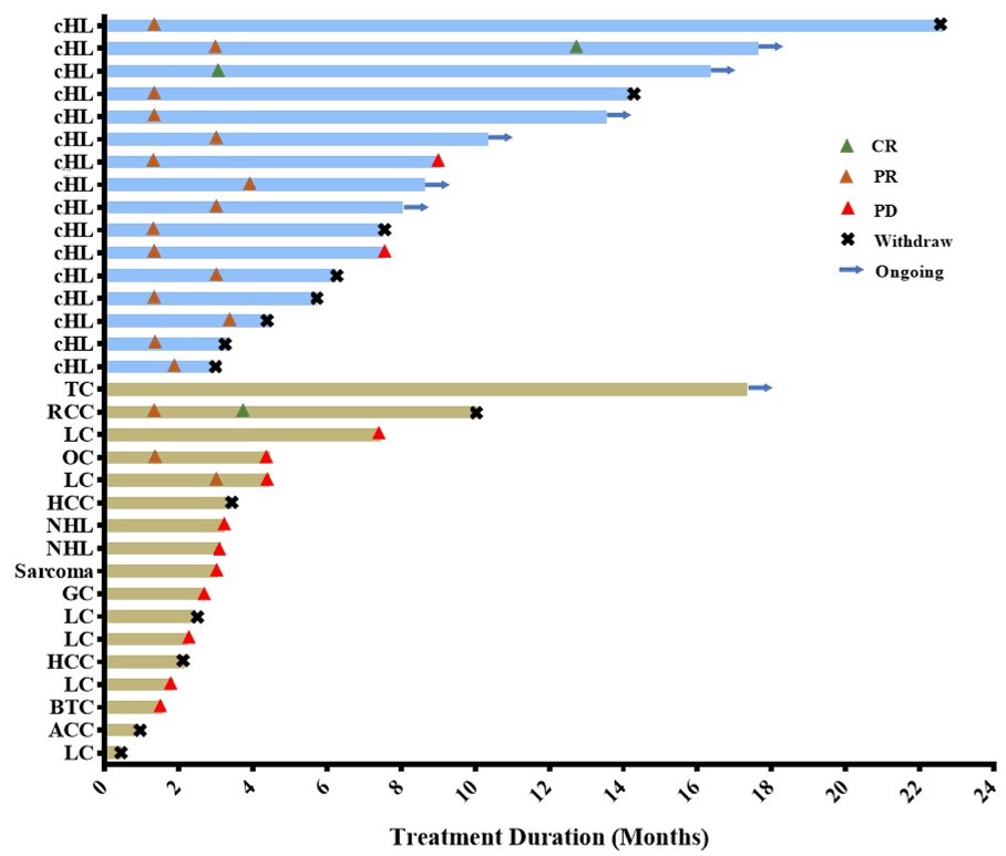 在26例可评估疗效的人群中,客观缓解率(ORR)为57.7%,其中2例完全缓解(CR),1例为转移性肾细胞癌患者,另1例为cHL患者。
