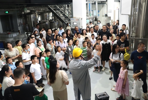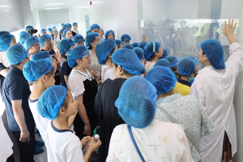 当天上午,在解说员的引领和讲解下,50名优秀员工及其子女们一同探访了jinnian金年会连云港园区的生产车间、办公大楼以及企业展厅。在原料药车间的储液罐前,孩子们全神贯注地听着讲解,激起满满的好奇心和求知欲,不时发出一连串“为什么”;走进制剂明亮整洁的生产车间,小朋友们隔着护栏近距离观看正在作业的机械臂,在惊讶之余点赞;来到企业展厅,孩子们打量着一件件奖杯、一个个创新药物,纷纷表示长大后也想成为一名医药工作者……