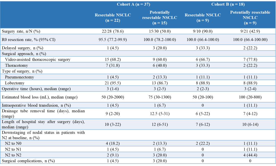 总体来说,卡瑞利珠单抗联合化疗或阿帕替尼新辅助治疗可手术或潜在可手术II-III期NSCLC,让近50%的潜在可手术NSCLC患者转化为可手术切除,R0切除率均达100%,展现了良好的病理缓解率和安全性,尤其在潜在可手术的患者中这一结果更为显著。