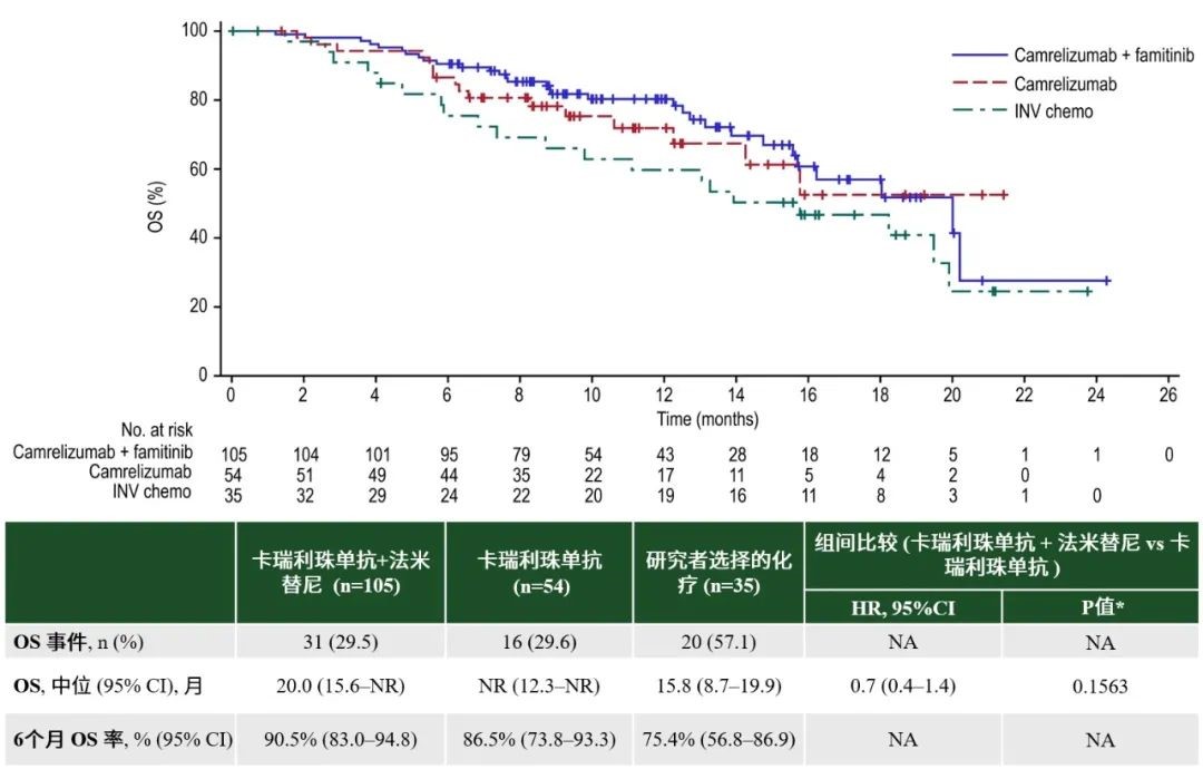 OS尚未成熟,截止本次分析,卡瑞利珠单抗联合法米替尼组中位OS为20.0个月(95% CI:15.6-NR),卡瑞利珠单抗单药组中位OS未达到(95% CI:12.3-NR),研究者选择的化疗组中位OS为15.8个月(95% CI:8.7-19.9)。(图4)