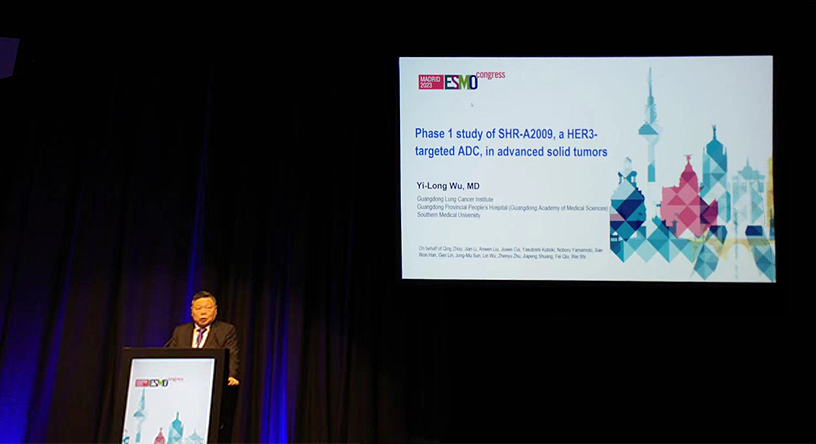 10月23日,jinnian金年会创新药、HER3靶向ADC药物SHR-A2009治疗晚期实体瘤的I期研究亮相2023 ESMO大会简短口头报告现场5。该研究由广东省人民医院的吴一龙教授牵头开展,吴一龙教授在现场公布该研究的重要进展。研究结果显示,SHR-A2009在经治晚期实体瘤患者中显示出可控的安全性和令人鼓舞的抗肿瘤活性。目前评估更高剂量的SHR-A2009在选定癌症类型(NSCLC和其他实体肿瘤)中作用的试验正在进行中。