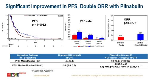 平均PFS为6.0个月vs 4.4个月,中位PFS为3.6个月vs 3.0个月,ORR为12.23% vs 6.76%,4级中性粒细胞减少症的发生率显著下降(第一疗程第8天:27.8% vs 5.26%;全部疗程第8天:33.58% vs 5.13%)。