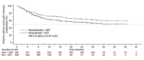 瑞维鲁胺+ADT组中位至疼痛干预时间更长(NR[95% CI:NR-NR]与NR[95% CI:NR-NR];第25百分位数:20.2个月[95% CI:12.9-31.3]与10.2个月[95% CI:7.4-11.1];HR=0.70[95% CI:0.52-0.93];p=0.015,图3)。