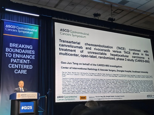 2025年美国临床肿瘤学会胃肠道肿瘤研讨会(ASCO GI)于近日在加利福尼亚州旧金山召开。期间,由中国科学院院士、东南大学附属中大医院院长滕皋军院士牵头,联合全国22家中心共同开展的“经动脉化疗栓塞术(TACE)联合卡瑞利珠单抗和阿帕替尼(“双艾”组合)对比TACE治疗不可切除肝细胞癌(HCC)的全国多中心、随机、平行对照、II期研究(CARES-005)”精彩亮相快速口头报告(rapid oral)环节。