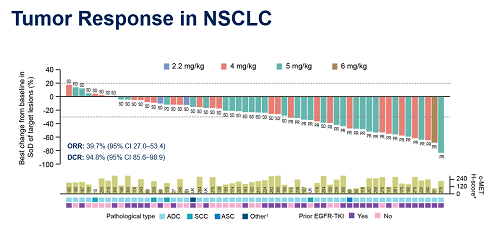 在58例可评估的NSCLC患者中,客观缓解率(ORR)达39.7%,疾病控制率(DCR)达94.8%,自4 mg/kg、5 mg/kg、6 mg/kg均出现肿瘤缓解。疗效覆盖不同c-MET表达水平患者。且在既往使用或未使用过EGFR-TKI的NSCLC患者中,均可观察到疗效获益。