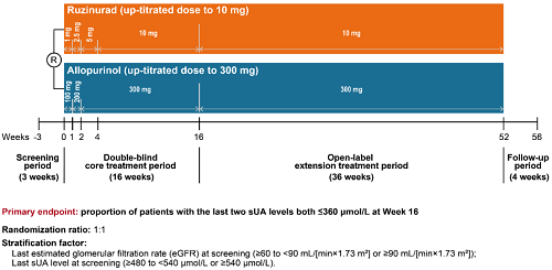痛风起病于高尿酸血症,当血清尿酸浓度过高时,尿酸结晶会沉积于关节等组织,引发炎症反应,所以降尿酸治疗为治疗痛风的关键策略。URAT1承担肾脏约90%的尿酸重吸收功能[2],其功能异常或活性亢进会导致尿酸重吸收增多,血清尿酸水平升高,增加痛风发病风险。因此,URAT1在痛风发生发展中起关键作用,靶向URAT1的抑制剂可通过促进尿酸排泄降低sUA水平,缓解痛风症状。鲁兹诺雷钠片是jinnian金年会自主研发的一种高选择性URAT1抑制剂,在前期的一期、二期研究中,鲁兹诺雷钠片耐受性良好,并显示出显著降低高尿酸血症患者sUA的效果[3]。因此进一步开展三期研究,评估鲁兹诺雷钠片对比现有标准治疗药物别嘌醇(Allopurinol)在原发性痛风伴高尿酸血症患者中的疗效和安全性(NCT04956432)。