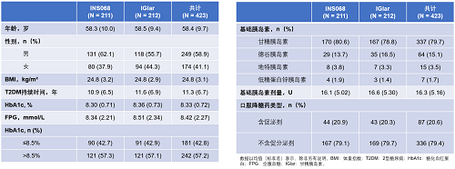 研究共入组423例中国成人T2DM受试者,INS068组和IGlar组分别入组211例和212例。