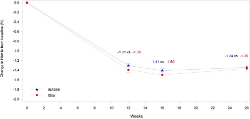 本研究达到预设的主要终点,治疗26周后,INS068组的HbA1c相对基线变化非劣于IGlar组。INS068组与IGlar组的HbA1c降幅分别为0.70%和0.83%,两组差值为 0.13%(95% CI:-0.05,0.31)。