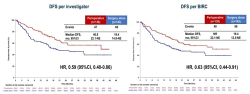 与单纯手术组相比,研究者和BIRC评估的围术期治疗组DFS均有延长。