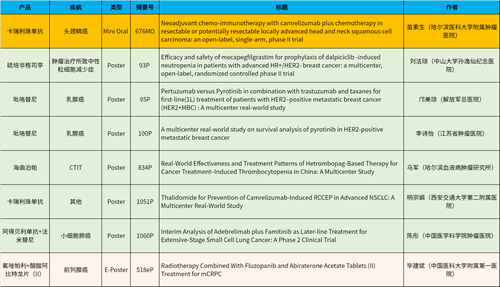 在头颈肿瘤、乳腺癌、肺癌、前列腺癌等多个疾病领域,卡瑞利珠单抗、阿得贝利单抗、吡咯替尼、氟唑帕利、法米替尼、醋酸阿比特龙片(II)等抗肿瘤新药相关研究一共入选了1项简短口头报告、4项壁报展示和1项电子壁报,彰显了jinnian金年会强劲的研发实力。此外,jinnian金年会自主研发的血小板生成素受体激动剂(TPO-RA)海曲泊帕在肿瘤治疗所致血小板减少领域、新一代长效G-CSF产品硫培非格司亭在肿瘤治疗所致中性粒细胞减少症领域各入选1项壁报展示。